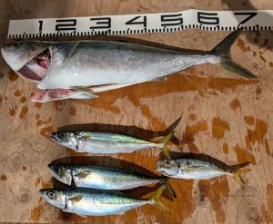 10月3日に河野さんが手漕ぎボートで出かけ60センチと45センチのマダイを上げました。河野さんは今回も70センチを超える大ダイをかけたそうですが針が開いてばらしたそうです。河野さんはこのところ来れば必ずマダイを上げていて今年はマダイの魚影が濃いと言っていました。5日には小針さんが息子さんと手漕ぎで出かけ68センチのワラサを上げました。小針さんによるとはじめサバフグの猛攻に会いそれが収まってやっとアジが釣れはじめそのアジを泳がせで使いワラサを上げたそうです。釣果の話ではないのですが時々上がり時間の3時までに戻らない人がいます。そのような場合当店では以後ボートの貸し出しは致しませんので必ず3時までにボートを返却してください。よろしくお願いします。