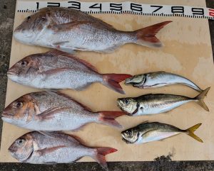 今年も残すところ2か月になりました。水温もだいぶ下がってきましたが相変わらずサバフグが多く場所によっては仕掛けばかり取られて釣りになりません。例年水温が下がるとサバフグも深場に移動するのですが今年はもう少しかかるかもしれません。その関係もあってマコガレイを釣るのは難しい状況です。それでも先日40センチオーバーを上げた人がいました。マダイを狙っていても場所によってはサバフグが邪魔をするようです。そんな中10月12日には長島さんが59センチを上げ11月1日には川島さんと村中さんが71センチを筆頭にマダイ4枚に大アジなどを上げ、同じ日に五十嵐さんも71センチ、菊地さんは51センチを上げています。アジに関しては大アジを何匹か上げてくる人と小アジや中アジをたくさん上げてくる人がいてポイント次第という感じです。もちろんサバフグが寄って来てアジは一匹も釣れない人もいます。その他ではカワハギも釣れはじめ手漕ぎで行った吉田さんが40枚くらい釣っていました。